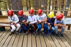 The success of climbing as a multi-adventure activity on school trips has led to the development of various themed parks centred on this activity. One such example is what are known as ropes courses. A ropes course is a themed park in which a variety of multi-adventure and mountain-related activities take place. They are usually situated in natural surroundings, typically in forests or wooded areas, which is why this activity is often referred to as arborism. This is because the trees themselves are integrated into the activity and serve as a base for several similar activities. One of the highlights is the zip line. By means of a system of pulleys, ropes and counterweights, the participant is transported — secured by a harness attached to a rope — from one point to another above the ground.